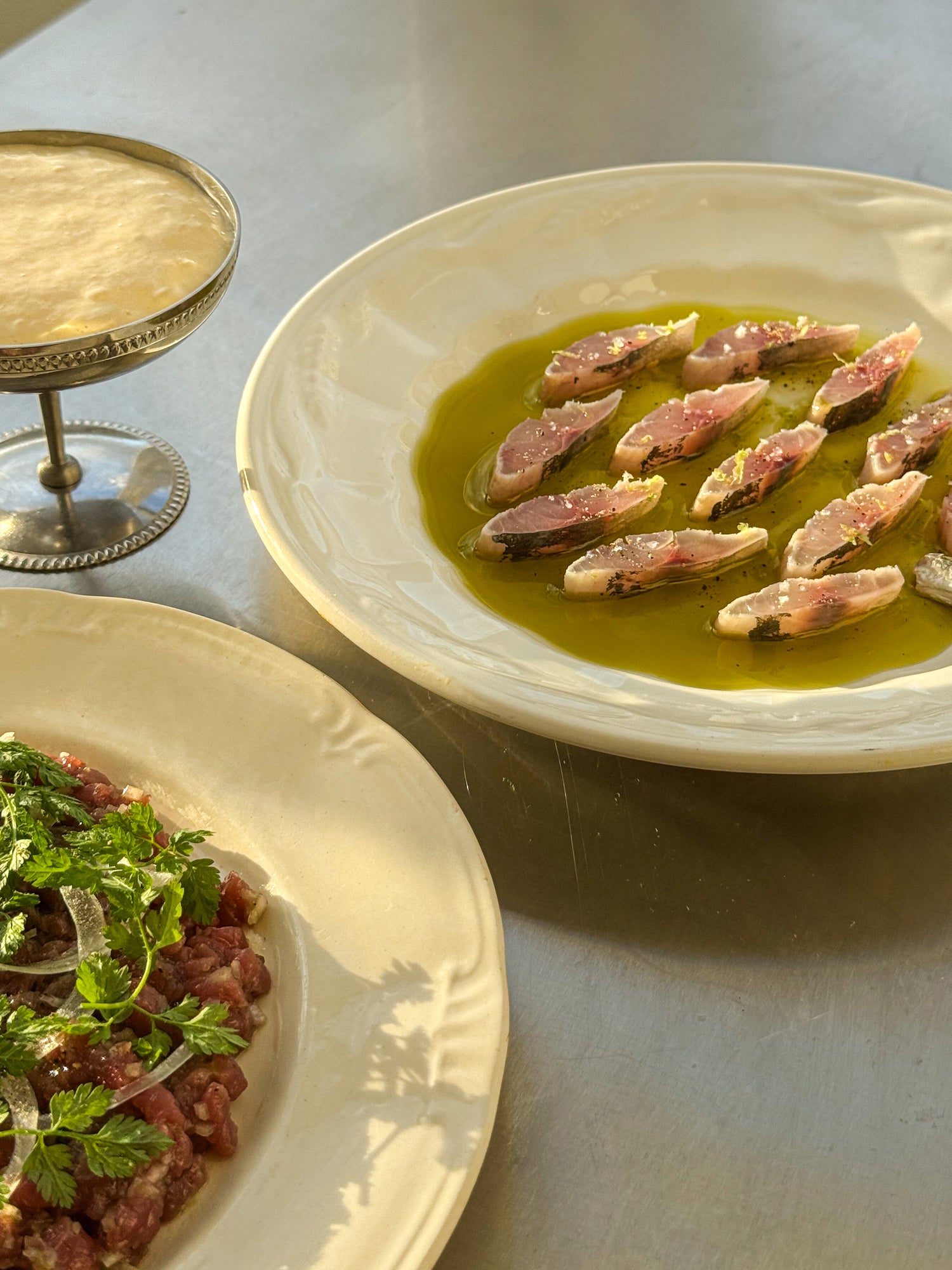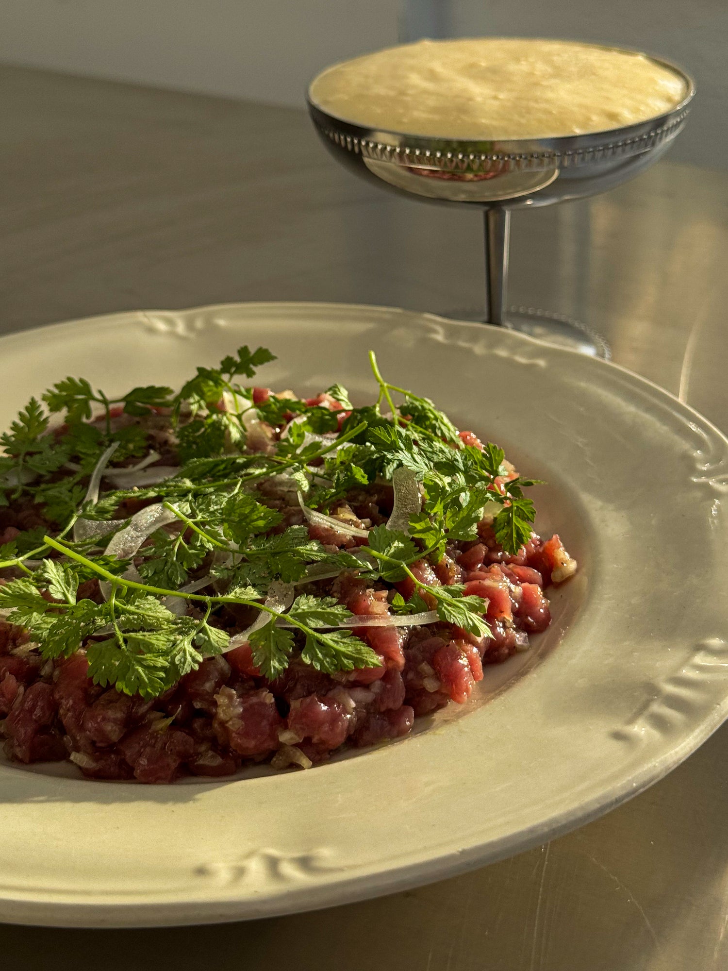 For this edition, he’s created two plates just for us: a bright cured sashimi and a hand-cut beef tartare with warm chervil sabayon. Both are designed for sharing and lingering over with a glass of wine in hand. Invite some friends, put on a vinyl, and meet us in the kitchen.