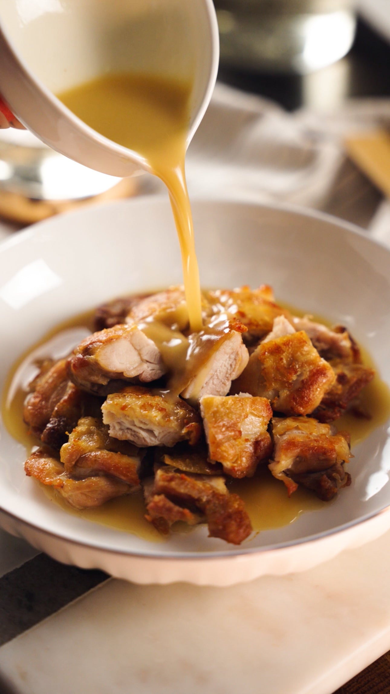 13. To serve, cut your chicken into bite sized pieces and pour the Pho Spiced butter sauce over top.