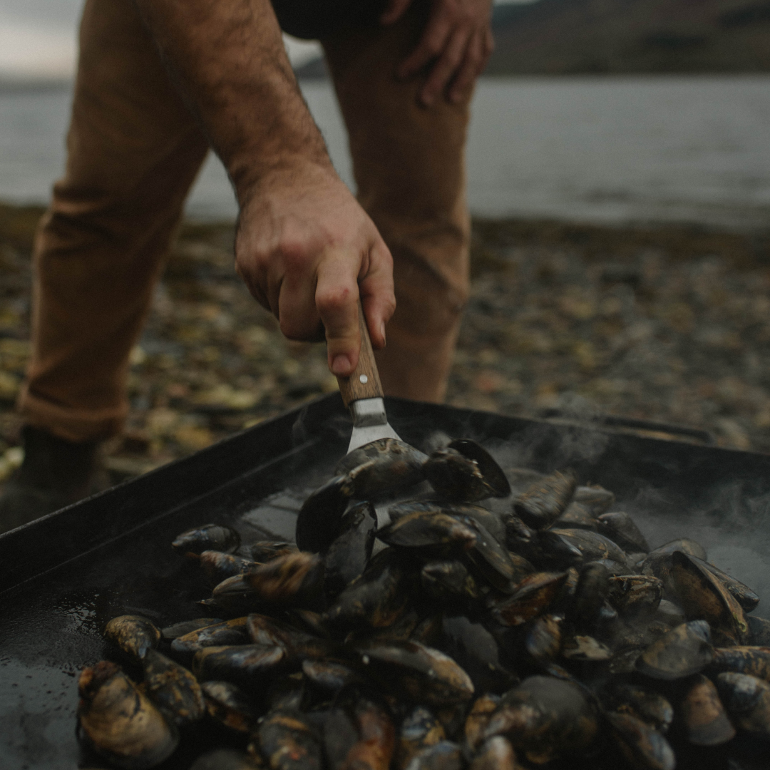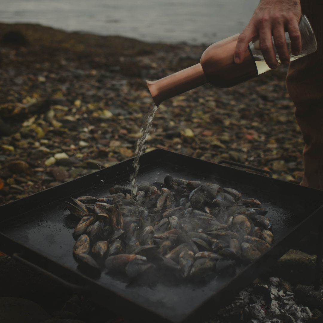 As the night began to draw closer, I lit another fire, closer to the water this time. Mussels are a representation of the Scottish shorefront and cooking them over a hot plancha is the best way to enjoy them.