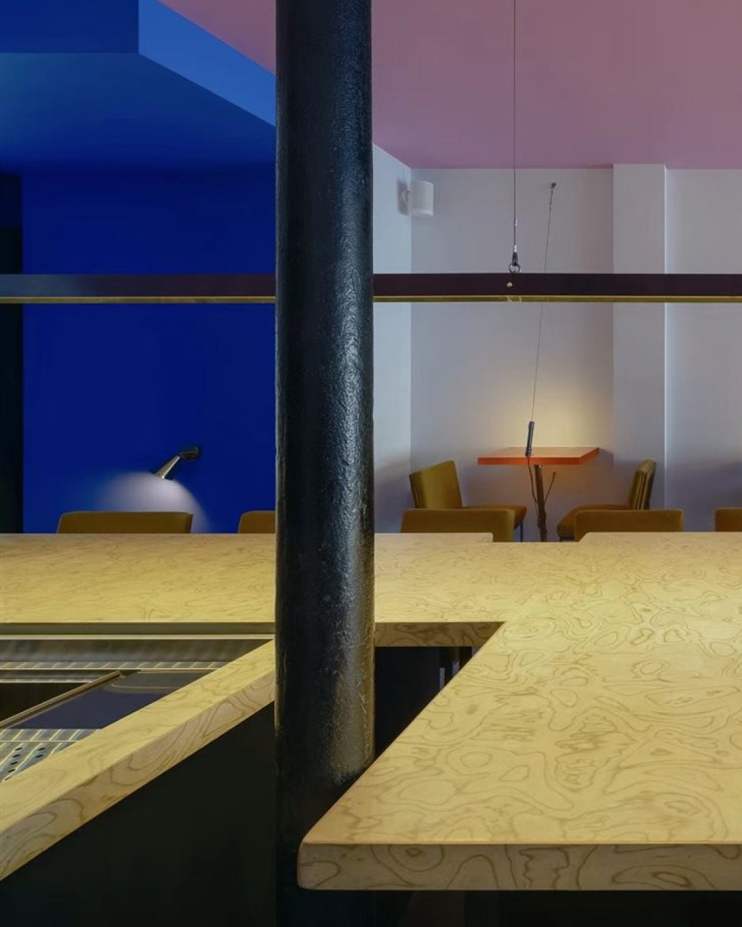Les détails se révèlent lentement. Ce bleu saisissant qui domine l'espace ? Il s'inspire du Qing Lian, un ton bleu-violet qui capture l'essence du crépuscule. À l'origine, ils voulaient un violet pur, mais les aspects pratiques les ont amenés à opter pour ce bleu semblable à l'indigo - parfois, les meilleures solutions sont le fruit de doux compromis.