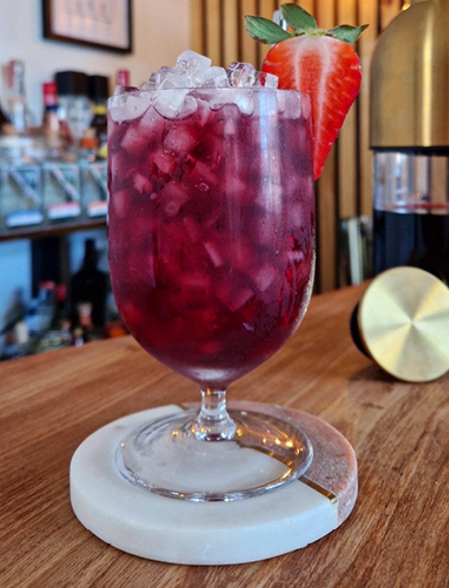 Le Cobbler est un cocktail pionnier car l'ajout d'une paille et de glace pilée permettait aux buveurs de siroter le cocktail sans craindre d'avoir de la glace dans le nez ! Owen apporte une nouvelle touche avec l'inclusion du Cabernet Sauvignon, et nous aimons la façon dont l'acidité du vin équilibre le sirop de fraise sucré.