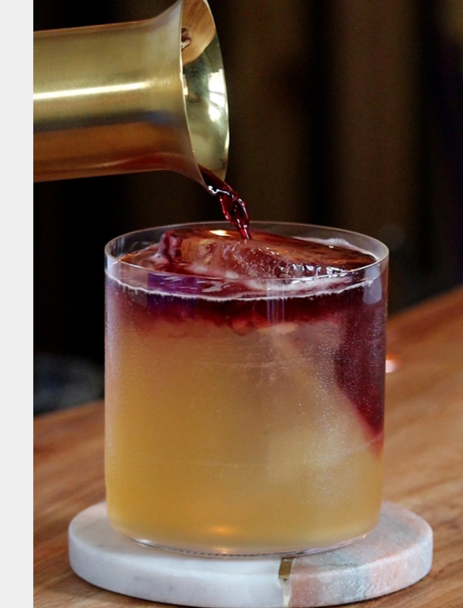 L'un des plats préférés d'Owen. Un cocktail aigre est traditionnellement composé d'alcool, d'agrumes et de sucre, mais le New York Sour comprend un flotteur de vin rouge sec - une couche de vin qui "flotte" sur le dessus de la boisson. En plus d'avoir un impact visuel frappant, le vin rouge ajoute une acidité fruitée au mélange aigre-doux du cocktail. La recette n'utilise que 15 ml de vin rouge, mais vous pouvez conserver le reste de la bouteille dans l'ETO. Utilisez un Shiraz ou un Malbec pour une saveur parfaite.