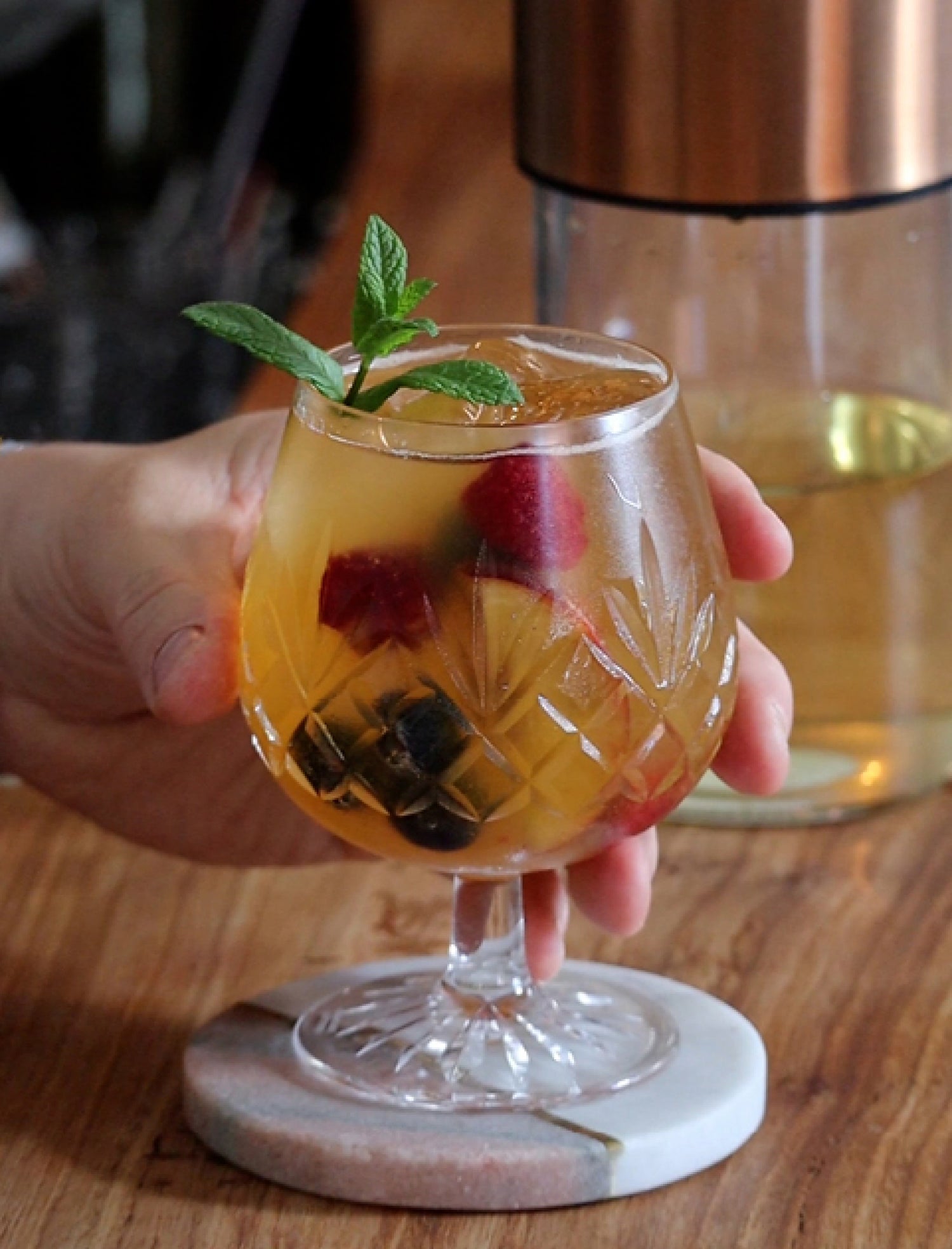 La sangria est le premier cocktail à base de vin, mais la recette d'Owen y ajoute une touche de modernité. Avec un mélange de baies et de fruits à noyaux, la sangria blanche est plus légère, plus vive et plus rafraîchissante que son équivalent rouge - et c'est une façon parfaite de nous préparer à l'été. Utilisez un vin blanc sec et vif comme le Chenin Blanc ou le Pinot Grigio. La sangria est traditionnellement servie dans un pichet, mais l'ETO vous permet de la déguster en une seule fois sans gaspiller une goutte de vin.